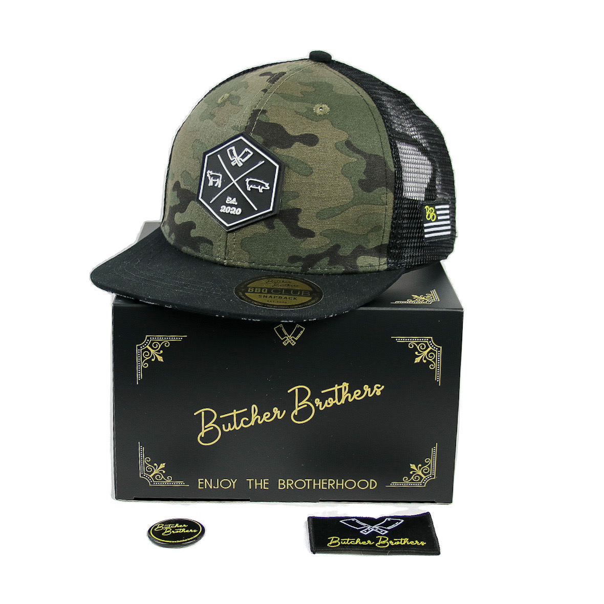 In this Box, the Camo Bros. cap is accompanied by the official ButcherBrothers patch with the logo of the crossed cleavers, the brooch and the very practical box, perfect for storing the snapback.