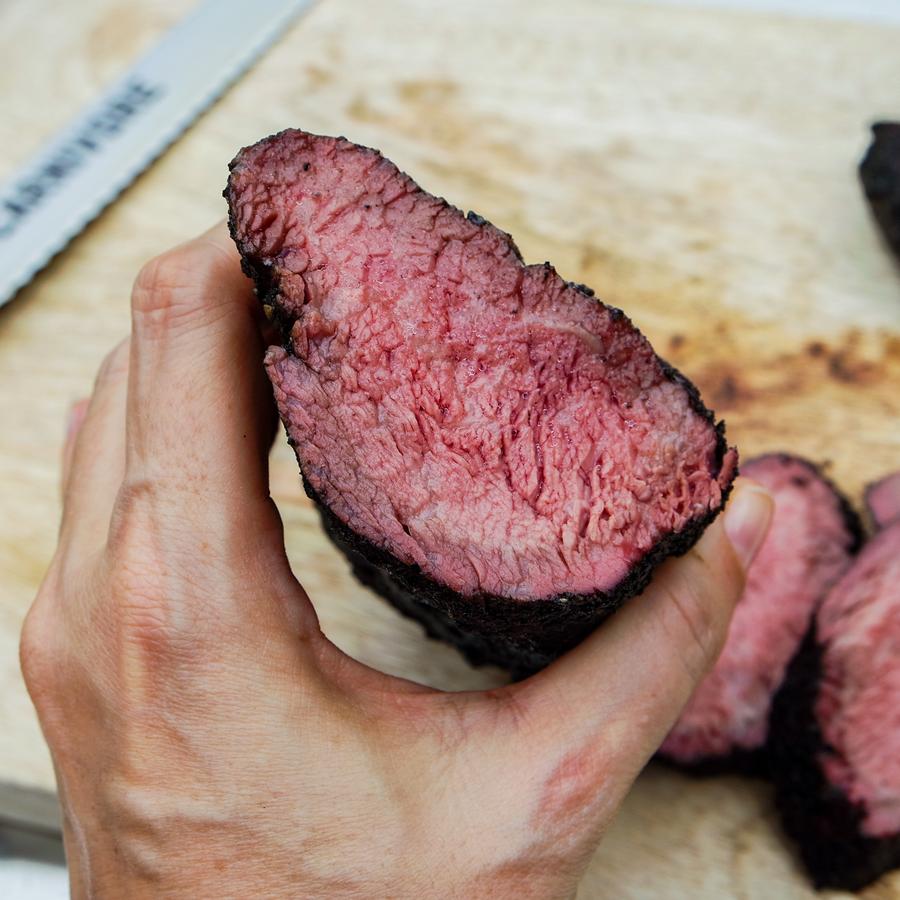 It gives the meat a fantastic appearance, creating a strong chromatic contrast between the outside of our cut which will be very dark and the inside which will instead appear pink and very light, without risking overcooking or even burning the meat.