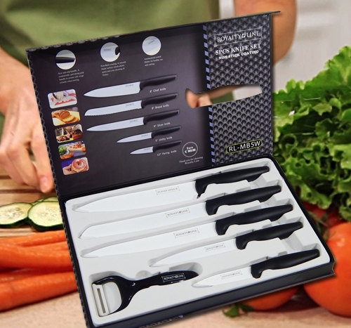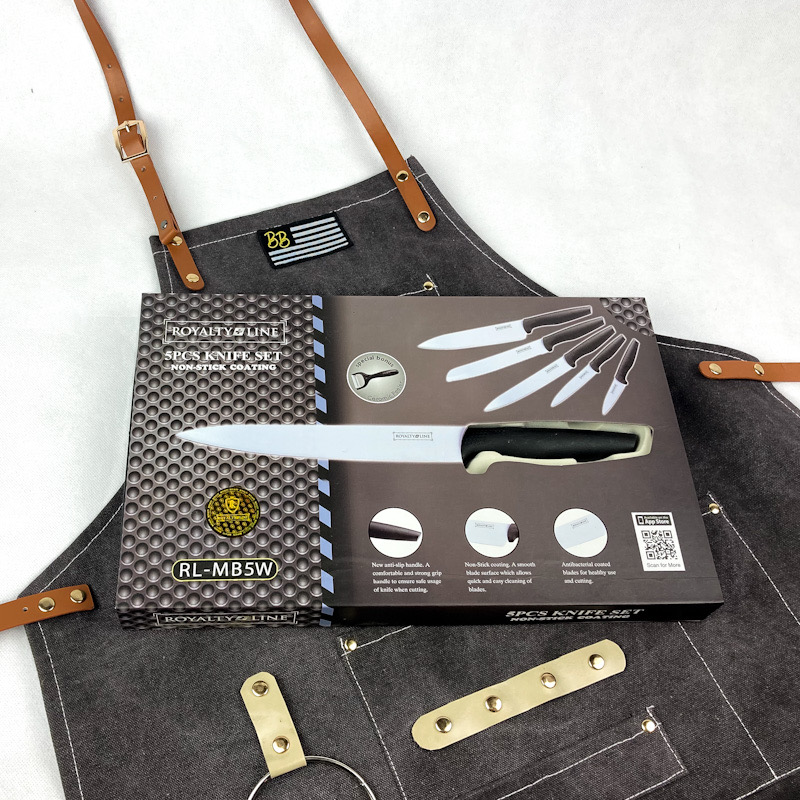 In fact, together with the beautiful and very comfortable Butcher Nation apron, in this box you will find the Royalty Line set with non-stick treatment of the blades which includes 5 knives that will surely be useful in the kitchen:
