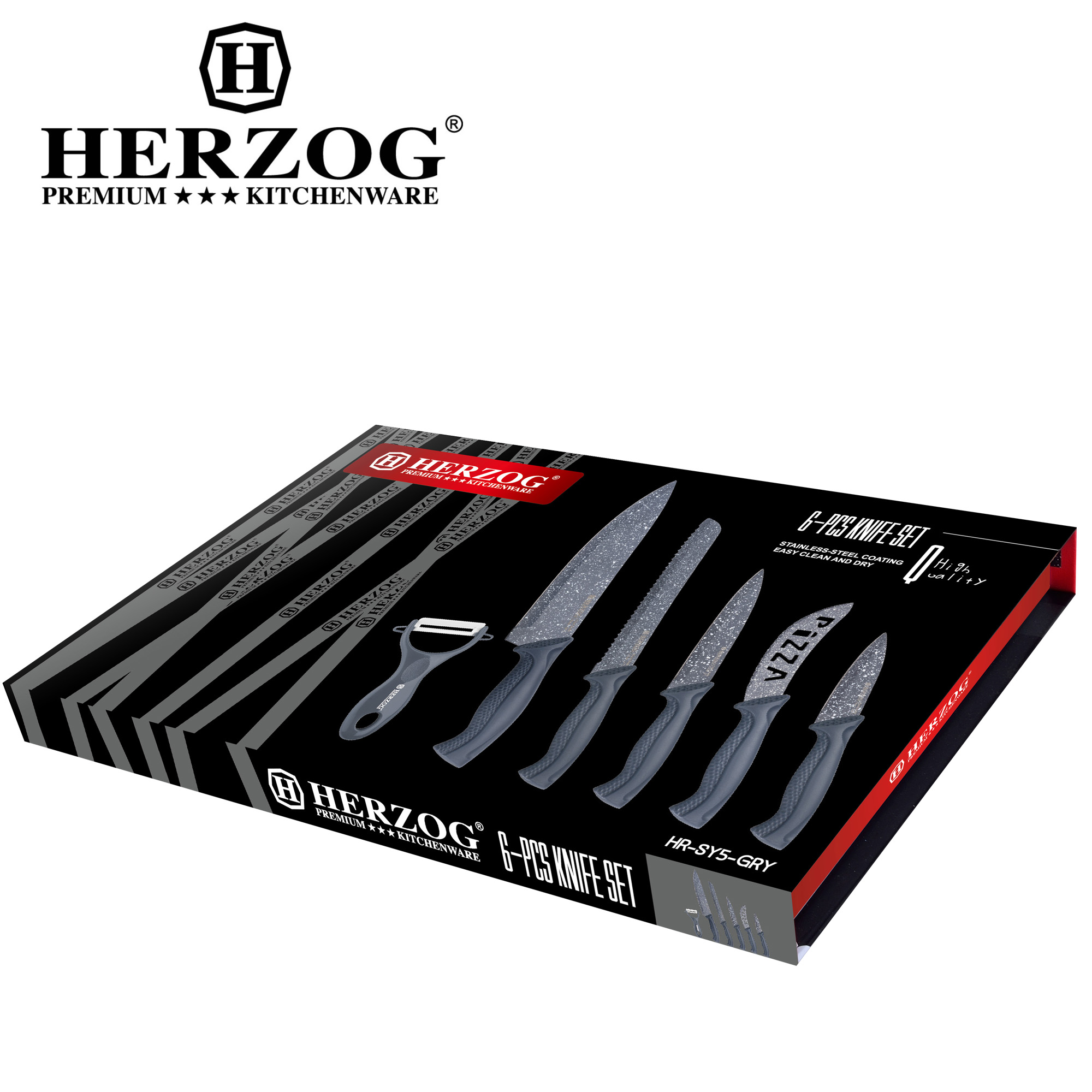 Il set di coltelli Herzog è composto da 6 pezzi realizzati in acciaio inossidabile rivestito con marmo per uso alimentare ddi colore grigio che garantisce una maggiore durata e uno stile moderno che lo rende perfetto in ogni spazio della cucina.